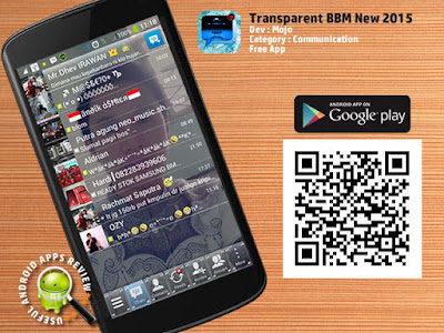1. Transparent BBM New 2015. Merupakan sebuah aplikasi yang bisa memberikan akses kepada para user untuk melakukan custom terhadap yang berhubungan dengan aplikasi BBM, seperti mengatur tombol, jam digital, tombul musik, tombol refresh maupun reload BBM, chat emotion, sampai pada data trafik. Aplikasi ini bisa di download secara gratis pada link Transparent BBM New 2015. Aplikasi ini di buat oleh Mr. Mojo.